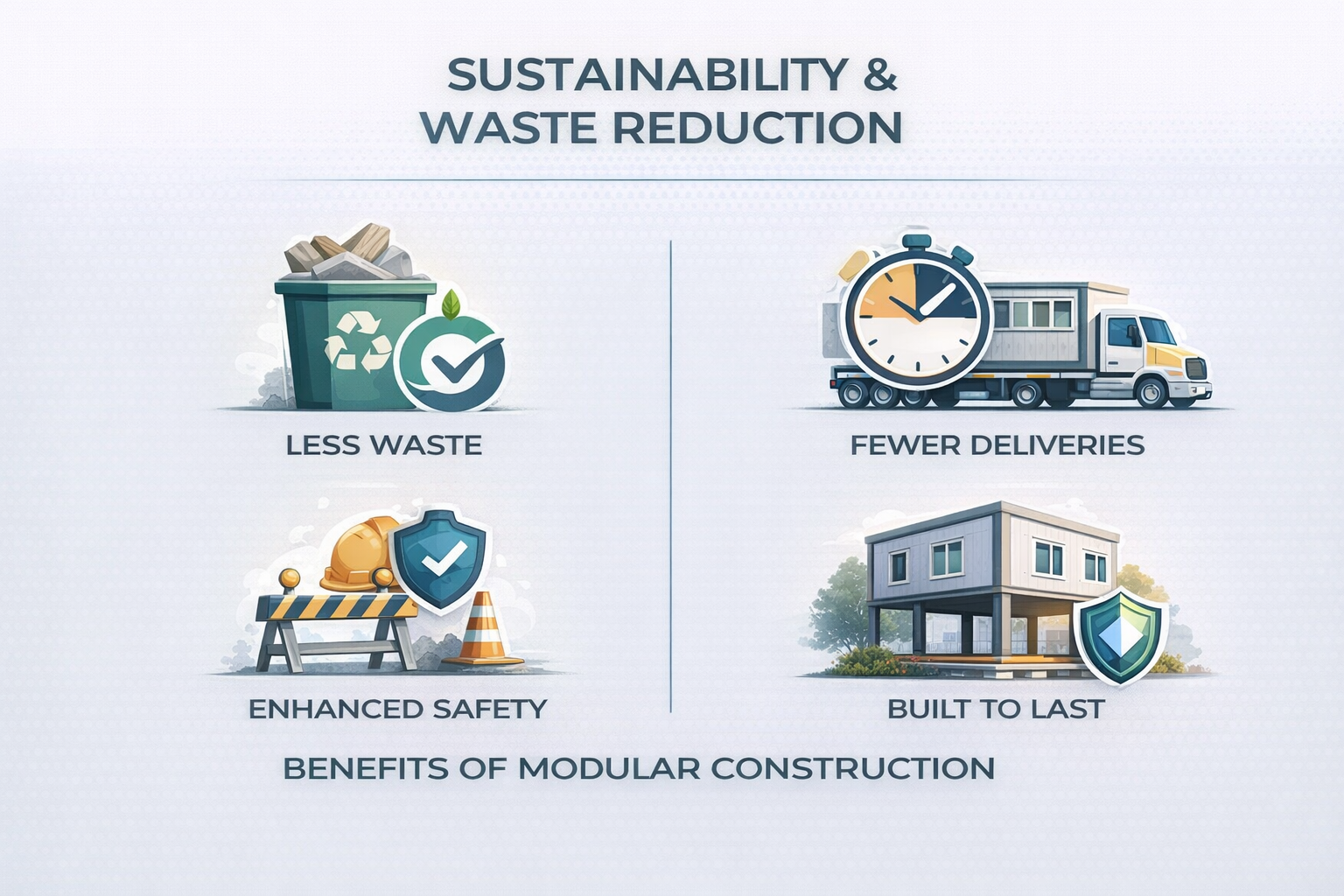 Modular construction supports this approach by shifting more work into controlled manufacturing, which reduces waste, site disruption, and rework.
